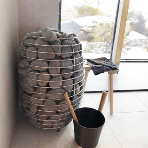 Split-face sauna stones are the only correct stones for electric heaters and woodburning stoves because they can store lots of heat and the water evaporates efficiently from the wide surface of the fracture. Angular split-face stones also allow for loose placement of the stones, which is the most important requirement, particularly in electric heaters in order to make it possible for the heat to be conveyed to the sauna room between the hot stones and heating elements. Good air circulation in the stone space makes the electric heating elements last for as long as possible.